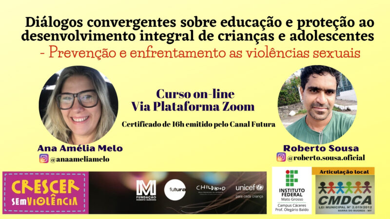 O Projeto Crescer Sem Violência – Canal Futura, da Fundação Roberto Marinho, em articulação com o Instituto Federal de Mato Grosso, IFMT, Campus Cáceres – Prof. Olegário realiza, desde a última segunda-feira (22.03), o curso on-line Diálogos Convergentes sobre Educação e Proteção ao Desenvolvimento Integral de Crianças e Adolescentes, com abordagem da temática: prevenção e enfrentamento às violências sexuais.